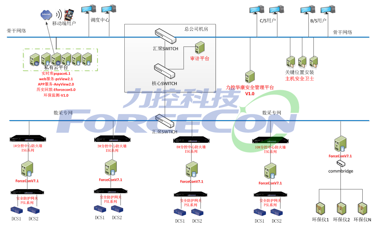 本次項(xiàng)目的實(shí)施范圍覆蓋該冶金集團(tuán)10個(gè)二級生產(chǎn)單位,共計(jì)大小DCS系統(tǒng)69套,環(huán)保數(shù)采儀120余個(gè),點(diǎn)數(shù)約3萬。監(jiān)控畫面400余幅,關(guān)鍵數(shù)據(jù)監(jiān)控點(diǎn)20000余個(gè)。系統(tǒng)依托pSpace實(shí)時(shí)數(shù)據(jù)庫平臺,自動記錄歸檔各監(jiān)測點(diǎn)位的實(shí)時(shí)數(shù)據(jù)。并根據(jù)工藝要求,配置關(guān)鍵監(jiān)測點(diǎn)的報(bào)警信息。生產(chǎn)調(diào)度平臺通過WEB發(fā)布可監(jiān)控pSpace數(shù)據(jù)庫中各監(jiān)控點(diǎn)位產(chǎn)生的報(bào)警信息,同時(shí)環(huán)保監(jiān)測數(shù)據(jù)通過環(huán)保監(jiān)測平臺進(jìn)行查詢,趨勢分析及展示。強(qiáng)大的歷史回放功能可在事故發(fā)生后對事故發(fā)生區(qū)域監(jiān)控界面進(jìn)行回放,監(jiān)測事故發(fā)生時(shí)各關(guān)鍵監(jiān)控參數(shù)的變化。為保證該冶金集團(tuán)二級生產(chǎn)單位的工控網(wǎng)絡(luò)安全,采用力控華康的工控安全防護(hù)網(wǎng)關(guān)及工業(yè)防火墻對工控網(wǎng)絡(luò)進(jìn)行防護(hù),確保二級生產(chǎn)單位免受木馬等病毒的威脅。
