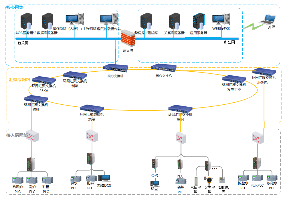 實(shí)現(xiàn)能源數(shù)采網(wǎng)絡(luò)的整體貫通建設(shè)獨(dú)立、安全、穩(wěn)定和可靠的能源數(shù)采通信網(wǎng)絡(luò),全面覆蓋公司各生產(chǎn)單位、各工藝設(shè)備,打通信息壁壘,同時(shí)進(jìn)行環(huán)網(wǎng)的補(bǔ)全規(guī)劃建設(shè),使主干網(wǎng)絡(luò)星環(huán)相接,保證企業(yè)信息高速通道的穩(wěn)定、暢通。