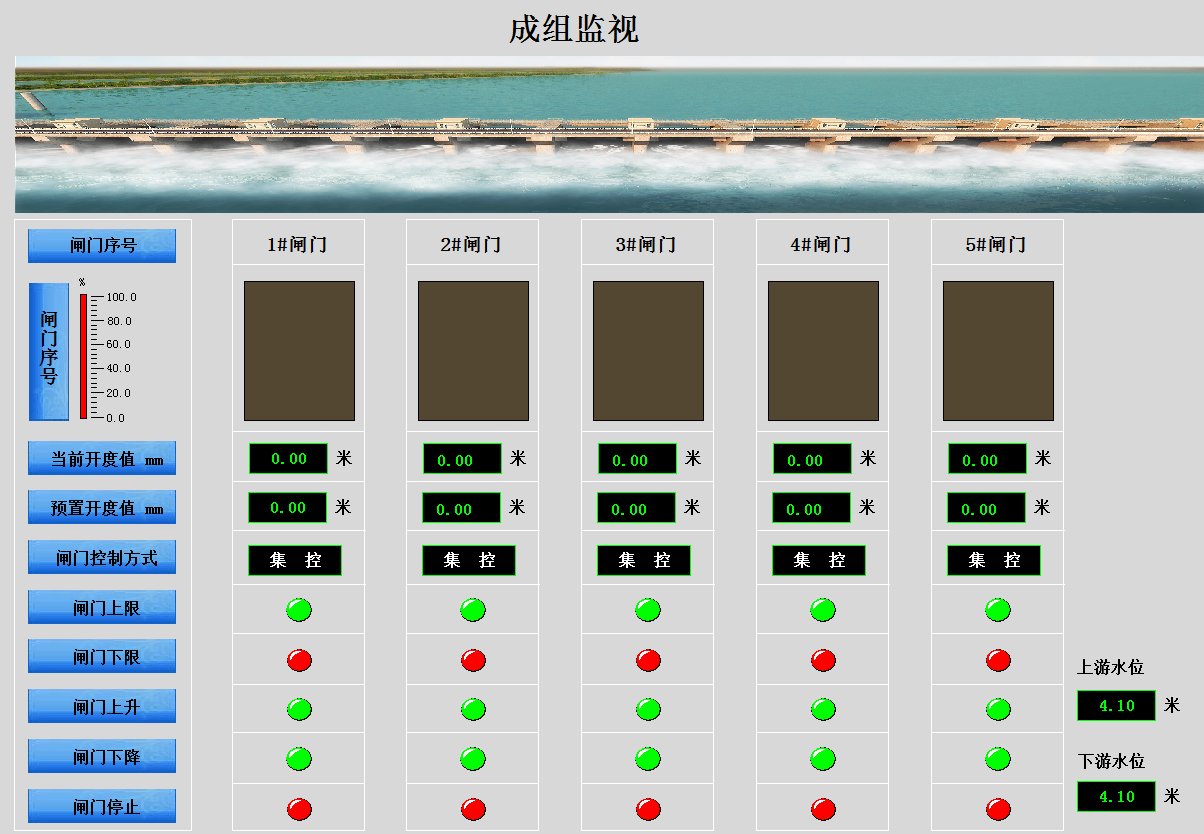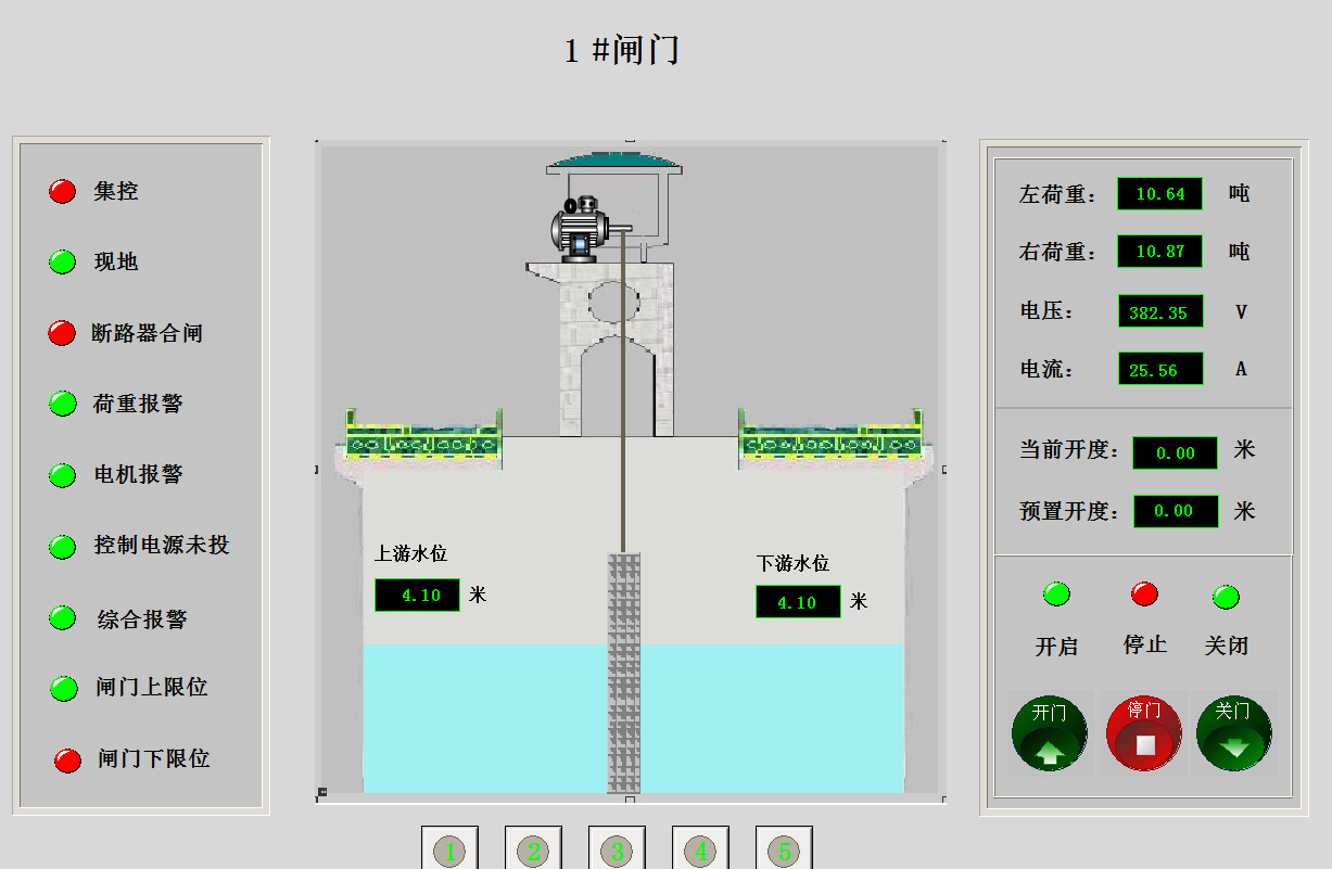 實(shí)時(shí)監(jiān)視控制閘門的狀態(tài)和數(shù)據(jù),通過(guò)開(kāi)關(guān)顏色狀態(tài)查看集控,現(xiàn)地,斷路器合閘,荷重報(bào)警,電機(jī)報(bào)警,控制電源未投,綜合報(bào)警,閘門上限位,閘門下限位的開(kāi)關(guān)狀態(tài),通過(guò)畫面可以查看左荷重,右荷重,電壓,電流,當(dāng)前開(kāi)度實(shí)時(shí)數(shù)據(jù),通過(guò)設(shè)置預(yù)置開(kāi)度調(diào)節(jié)水位,并可以開(kāi)啟和關(guān)閉閘門。