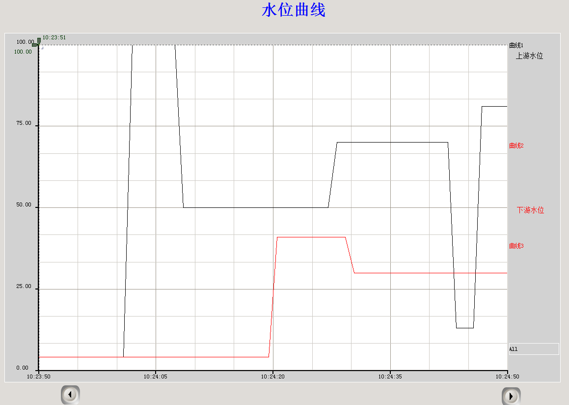 通過(guò)實(shí)時(shí)曲線可以查看水位的實(shí)時(shí)數(shù)據(jù)和趨勢(shì)走向,還可以通過(guò)曲線下面的按鈕向前向后調(diào)節(jié)坐標(biāo)軸的時(shí)間,查看其它時(shí)間的水位情況。