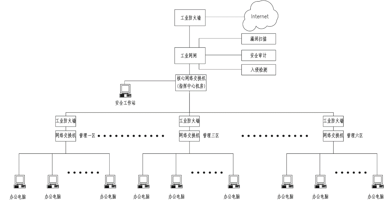在核心交換機(jī)(指揮中心機(jī)房)與因特網(wǎng)之間采用工業(yè)網(wǎng)閘,在進(jìn)行網(wǎng)絡(luò)物理隔離的同時實現(xiàn)了數(shù)據(jù)實時上傳,徹底阻斷了來自外網(wǎng)對工控網(wǎng)絡(luò)的安全威脅。