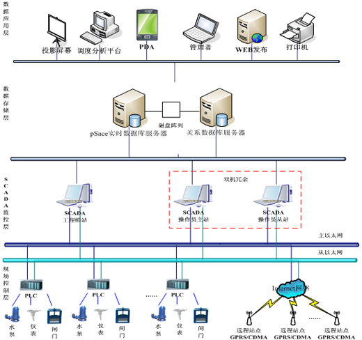 通過SCADA軟件實現(xiàn)對泵站龐大的現(xiàn)場數(shù)據(jù)高性能的數(shù)據(jù)采集與監(jiān)視,以實時的水情(以水文總站的水文水質(zhì)監(jiān)測系統(tǒng)的數(shù)據(jù)為主要依據(jù))、雨情(就近的雨量觀測站,加載降雨產(chǎn)流模型進行計算)、工情(水閘泵站自動監(jiān)測系統(tǒng)提供的閘門、水泵、電機、電源信息)為決策的主要依據(jù),同時綜合其他系統(tǒng)信息(如排水的信息系統(tǒng)、水資源普查的地理信息系統(tǒng)、內(nèi)河防汛墻的地理信息系統(tǒng)以及河道縱橫斷面情況等)并結(jié)合最新或預(yù)報的氣象信息,在專家系統(tǒng)的作用下生成不同操作控制下的模擬運行結(jié)果,以確定最佳的防汛和引清調(diào)水方案,并以形象直觀的WEB方式顯示出來;結(jié)合GIS地理信息系統(tǒng)并輔以水位、水質(zhì)、閘位、河道槽蓄容量、流量、引排水量、防汛墻高度、區(qū)域積水深度等三維空間參數(shù),充分利用完整的實時數(shù)據(jù)庫和報警事件數(shù)據(jù)庫中的數(shù)據(jù),基于所存儲的歷史數(shù)據(jù)方便的進行分析統(tǒng)計、事故分析和追憶,實現(xiàn)大型泵站設(shè)施的智能化運行。