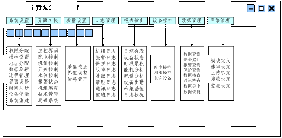 根據(jù)泵站設(shè)備工作操控流程設(shè)計為監(jiān)控界面系統(tǒng)(主控界面、配電系統(tǒng)界面 、單機組界面、綜合參量界面),操控流程(配電系統(tǒng)、機組系統(tǒng)、綜合監(jiān)控),日志系統(tǒng)、報警系統(tǒng)、保護系統(tǒng)、數(shù)據(jù)存貯系統(tǒng)、數(shù)據(jù)網(wǎng)絡(luò)發(fā)布系統(tǒng),邏輯參量修正系統(tǒng)、控制輸出系統(tǒng),查詢系統(tǒng),安全維護系統(tǒng),報表系統(tǒng)。
