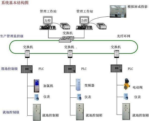 污水處理的方法一般有氧化溝法﹑SBR法﹑鼓風(fēng)曝氣法﹑AB法﹑A2O法等工藝方法,針對(duì)不同的工藝需要制定相應(yīng)的控制方案,采用生產(chǎn)管理監(jiān)控級(jí)﹑現(xiàn)場(chǎng)控制級(jí)和就地控制級(jí)三層網(wǎng)絡(luò)結(jié)構(gòu),要求系統(tǒng)具備在線監(jiān)測(cè)及數(shù)據(jù)采集顯示、遠(yuǎn)程自動(dòng)控制和網(wǎng)絡(luò)通訊、檢測(cè)數(shù)據(jù)分析﹑管理、系統(tǒng)監(jiān)測(cè)及故障報(bào)警等功能。本污水處理項(xiàng)目電氣自控系統(tǒng)以三菱Q系列PLC和網(wǎng)絡(luò)系統(tǒng)為控制系統(tǒng)主干,并配以人機(jī)界面來(lái)提升操作友好度,同時(shí)通過(guò)安裝在上位工控機(jī)的力控監(jiān)控組態(tài)軟件來(lái)監(jiān)控整個(gè)系統(tǒng)的運(yùn)行狀況。該系統(tǒng)設(shè)計(jì)要求采用集散型控制系統(tǒng),采取“集中監(jiān)測(cè),分散控制”的原則,由廠級(jí)中央監(jiān)控工作站和現(xiàn)場(chǎng)分散就地PLC控制站組成全廠工業(yè)控制網(wǎng)。