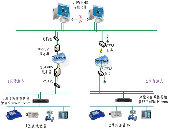 系統(tǒng)中由CEMS煙氣自動(dòng)監(jiān)測(cè)儀從企業(yè)的排放煙道采集污染物排放數(shù)據(jù),由鍋爐運(yùn)行負(fù)荷采集裝置PLC采集鍋爐運(yùn)行負(fù)荷數(shù)據(jù),并通過力控環(huán)保數(shù)據(jù)傳輸管理儀pFieldComm接入Internet網(wǎng),城市環(huán)保局監(jiān)控中心則可以通過Internet訪問系統(tǒng)的WEB服務(wù)器,根據(jù)不同的用戶權(quán)限查看相應(yīng)的數(shù)據(jù),并可遠(yuǎn)程控制監(jiān)測(cè)儀器,實(shí)現(xiàn)遠(yuǎn)程監(jiān)控整個(gè)企業(yè)的煙氣排放污染物,此系統(tǒng)還能顯示各個(gè)監(jiān)測(cè)參數(shù)的實(shí)時(shí)趨勢(shì)曲線,自動(dòng)生成數(shù)據(jù)的日?qǐng)?bào)、周報(bào)、月報(bào)、年報(bào),實(shí)現(xiàn)可視化管理,為環(huán)境決策提供技術(shù)依據(jù)。