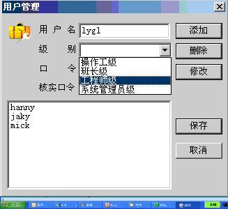 用戶可以建立不同級(jí)別多個(gè)用戶,級(jí)別和用戶名分別對(duì)應(yīng)于系統(tǒng)中的變量,利用這兩個(gè)變量的值可以自由設(shè)置操作權(quán)限。