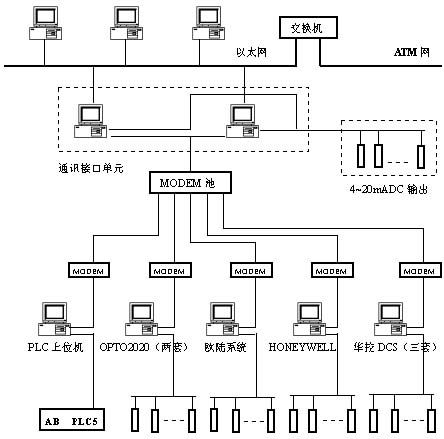數(shù)據(jù)采集管理系統(tǒng)在全公司計(jì)算機(jī)綜合信息管理系統(tǒng)中處于最底層,負(fù)責(zé)采集生產(chǎn)裝置自動(dòng)控制系統(tǒng)中的生產(chǎn)實(shí)時(shí)數(shù)據(jù),并將數(shù)據(jù)傳輸?shù)秸{(diào)度室監(jiān)控系統(tǒng)主機(jī)上,通過(guò)圖形畫(huà)面顯示輸出。該系統(tǒng)具有趨勢(shì)、報(bào)警、查詢等功能,使調(diào)度人員在調(diào)度室內(nèi)了解全廠各分布區(qū)域的生產(chǎn)情況,進(jìn)行調(diào)度管理,也為今后建立全公司綜合信息管理,實(shí)現(xiàn)無(wú)紙辦公和決策信息支持打下基礎(chǔ)。系統(tǒng)拓?fù)鋱D如下: