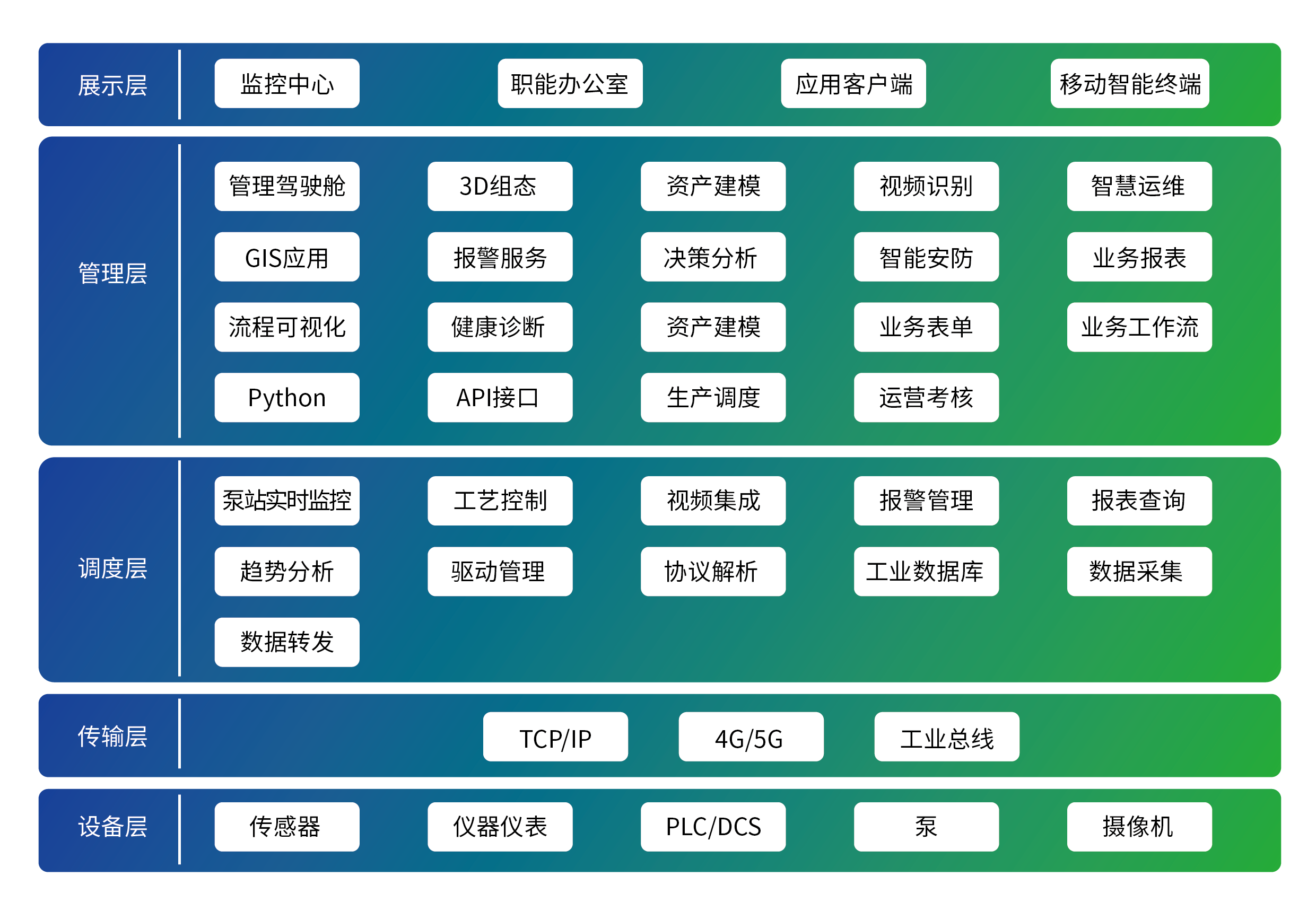 系統(tǒng)以物聯(lián)網(wǎng)為基礎(chǔ),于泵站關(guān)鍵處部署各類傳感器及智能設(shè)備,全方位采集設(shè)備、工藝、環(huán)境及能耗數(shù)據(jù),搭建起泵站運(yùn)行的感知網(wǎng)絡(luò)。通過穩(wěn)定通信網(wǎng)絡(luò),數(shù)據(jù)實(shí)時(shí)傳輸至處理中心,經(jīng)大數(shù)據(jù)分析與人工智能算法深度挖掘處理,實(shí)現(xiàn)泵站的自動(dòng)化、精細(xì)化管理,提高運(yùn)行效率,降低成本,保障供排水安全穩(wěn)定。