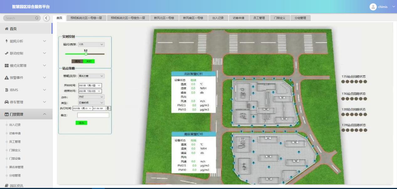 照明智能調(diào)節(jié):室外照明結(jié)合光感規(guī)則,綜管平臺(tái)根據(jù)日出日落時(shí)間自動(dòng)下發(fā)指令開(kāi)閉室外燈桿;室內(nèi)照明則在無(wú)訪客預(yù)約時(shí)段自動(dòng)關(guān)閉展廳燈光。