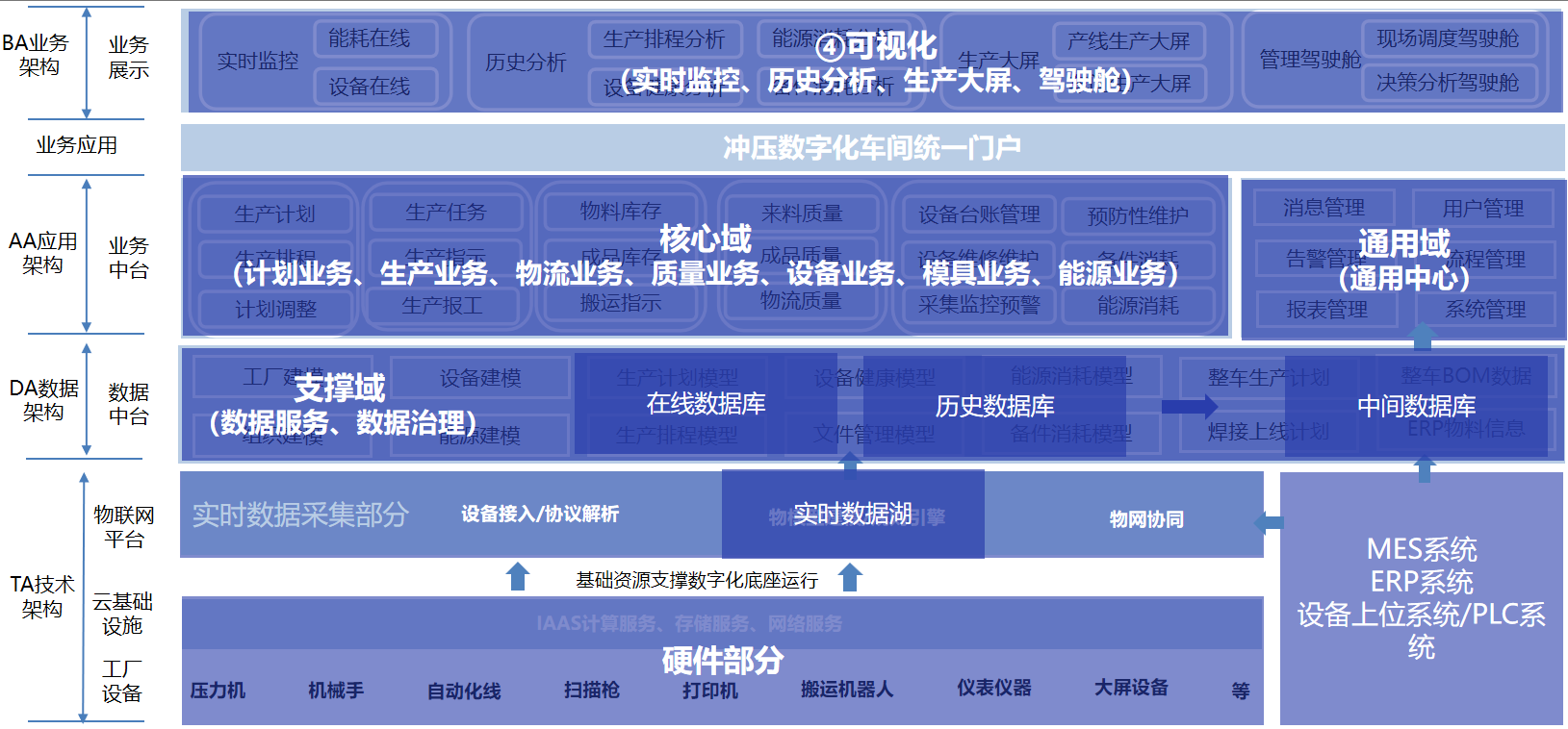 力控沖壓MES管理系統(tǒng)采用4A架構(gòu):在TA層,通過IOT物聯(lián)技術(shù)實(shí)時(shí)采集產(chǎn)線設(shè)備運(yùn)行與生產(chǎn)過程數(shù)據(jù);在DA層,通過數(shù)據(jù)治理實(shí)現(xiàn)業(yè)務(wù)數(shù)據(jù)與時(shí)序數(shù)據(jù)的融合綁定;在AA層,集成工廠業(yè)務(wù)系統(tǒng),打通車間業(yè)務(wù)流程壁壘;在BA層,結(jié)合3D技術(shù)與業(yè)務(wù)管理要求,構(gòu)建看-管-控一體化管理平臺(tái)。