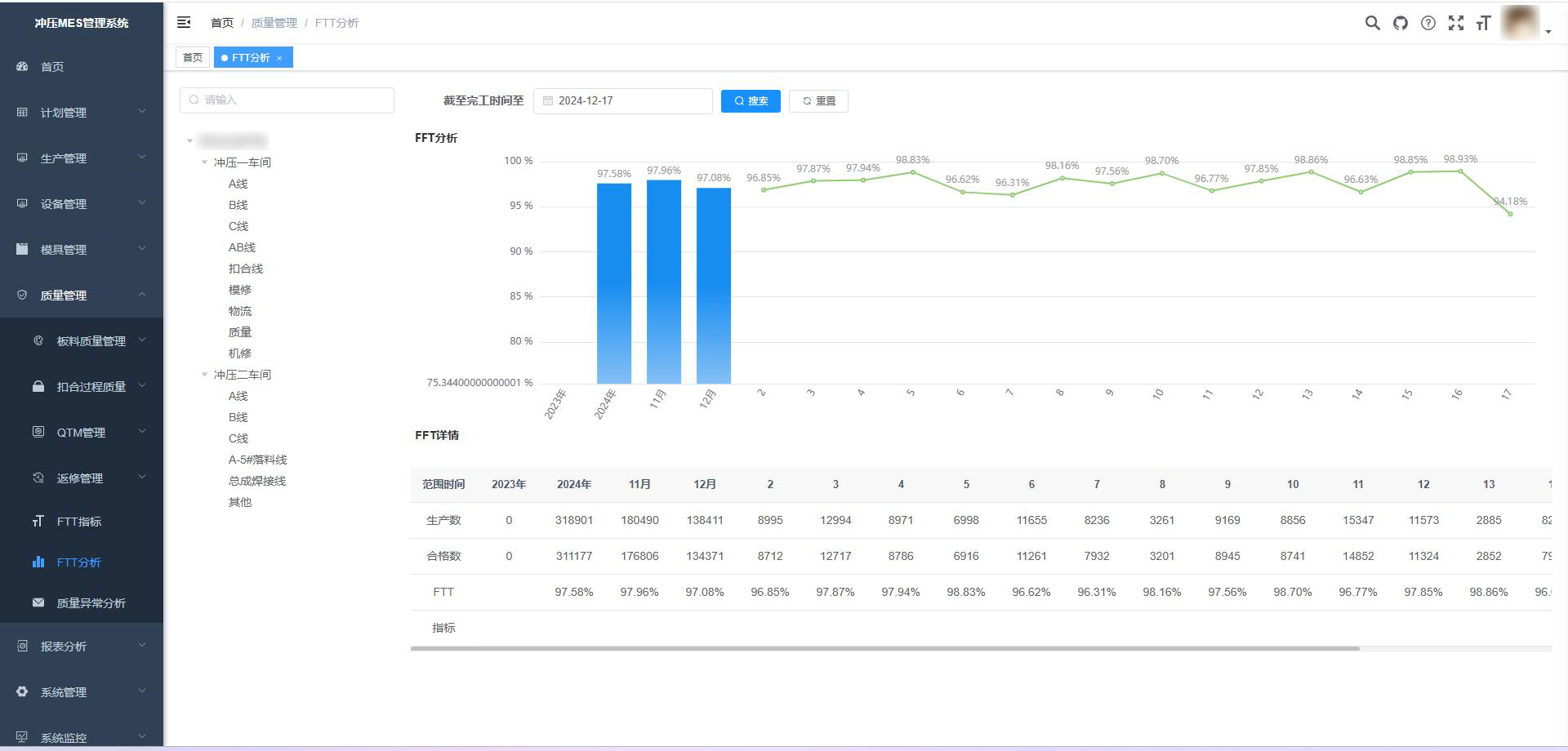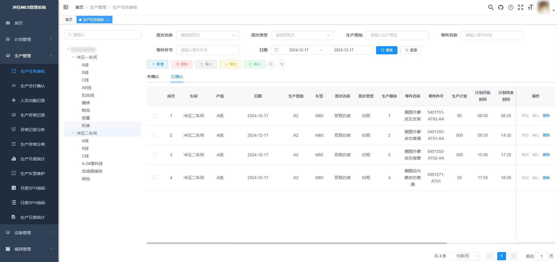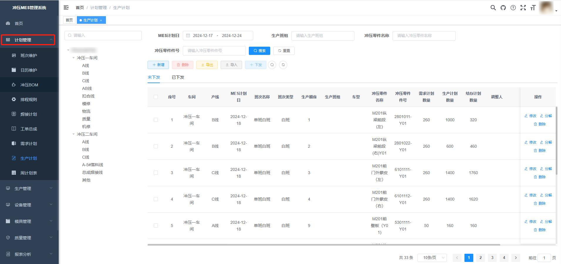 沖壓MES系統(tǒng)不僅提供車間總覽功能,實(shí)時(shí)展示各項(xiàng)管理指標(biāo),還集成生產(chǎn)監(jiān)控、計(jì)劃排程、質(zhì)量管理、設(shè)備管理、模具管理及報(bào)表分析等核心模塊,實(shí)現(xiàn)全流程數(shù)字化管控。