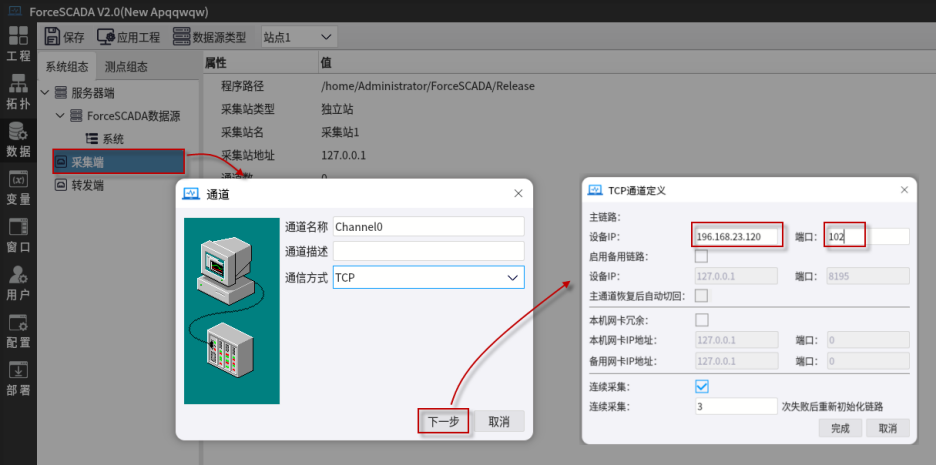 通道-通信方式(TCP)-TCP通道定義(設備IP,端口102)