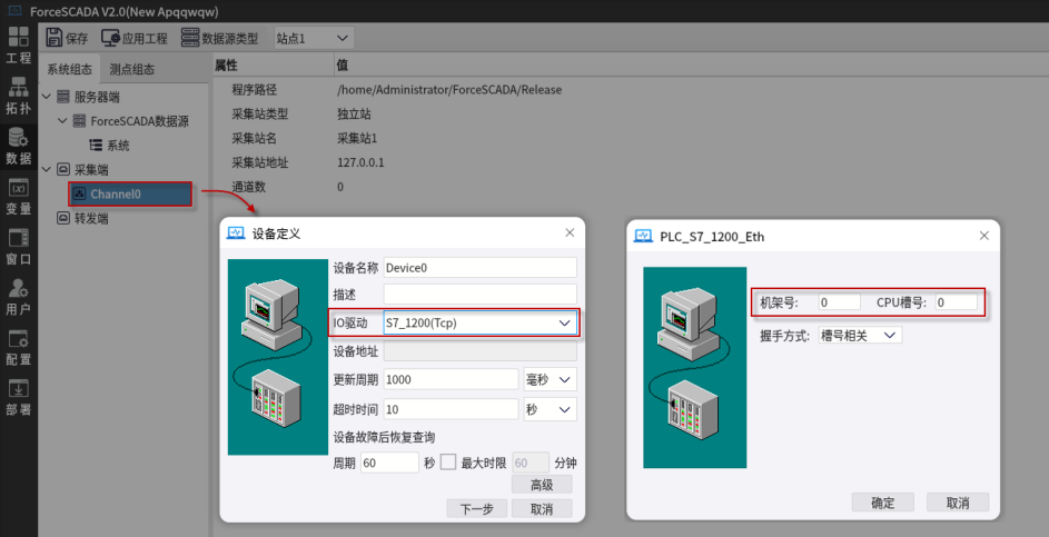 右擊通道-新建設備-IO驅(qū)動(S7-1200TCP)-機架號和CPU槽號(根據(jù)設備填寫)