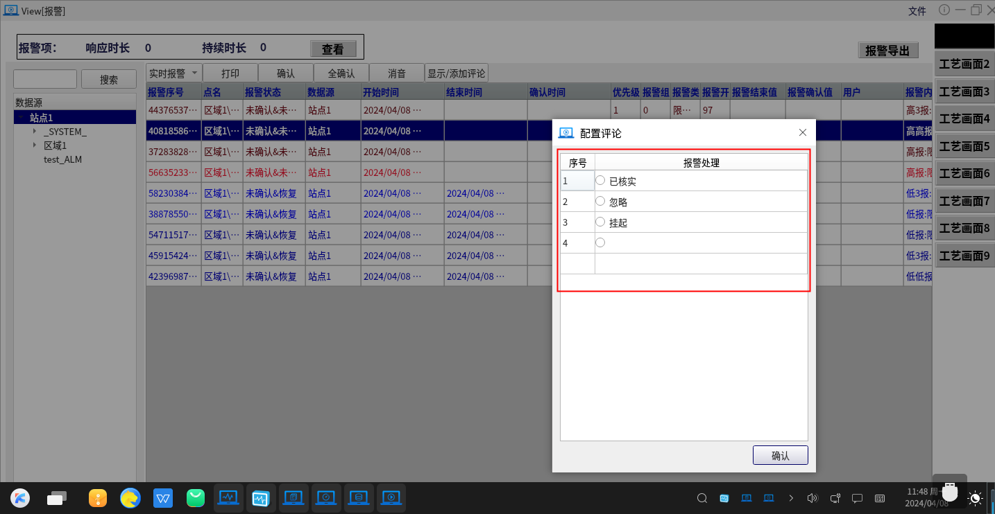 報警處理,根據(jù)報警信息字段內(nèi)容,依據(jù)工藝設(shè)備情況,報警處理時做評論標(biāo)注,便于問題或原因追蹤。