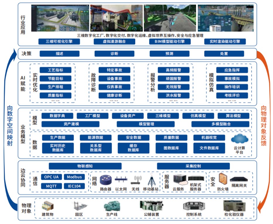 力控工業(yè)數(shù)字孿生平臺,通過機理和數(shù)據(jù)建模完成物理世界與虛擬世界的映射,建立與真實世界中的實體相對應的虛擬模型,通過實時數(shù)據(jù)連接、映射和分析,實現(xiàn)對實體的監(jiān)控,通過AI賦能實現(xiàn)系統(tǒng)實時優(yōu)化、過程仿真等功能。