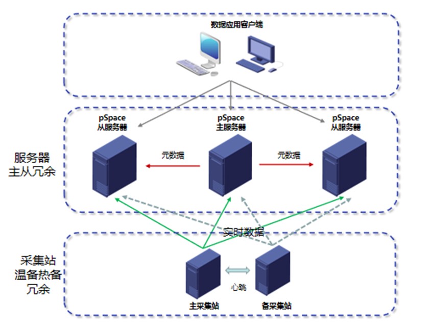 主從冗余:主服務(wù)器的元數(shù)據(jù)主動(dòng)同步到從服務(wù)器,保證主從服務(wù)器工程一致性;實(shí)時(shí)數(shù)據(jù)都來自采集站,保證實(shí)時(shí)數(shù)據(jù)一致性;斷線緩存功能確保數(shù)據(jù)的完整性;采集站冗余保證采集數(shù)據(jù)不丟失。
