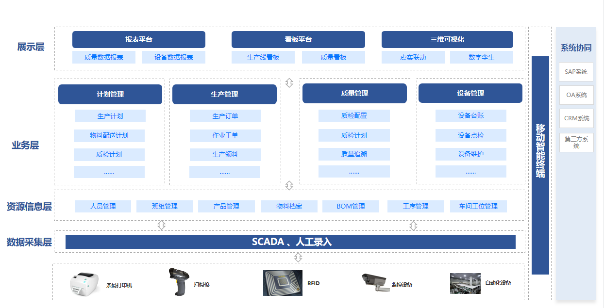 通過對工廠數(shù)據(jù)進(jìn)行集中的收集、分析和統(tǒng)計(jì),為企業(yè)提供各種可視化管理報表和看板,運(yùn)用工業(yè)平板、手機(jī)、PDA等移動端遠(yuǎn)程操作和查看,真正實(shí)現(xiàn)線上的智能化工廠管理。