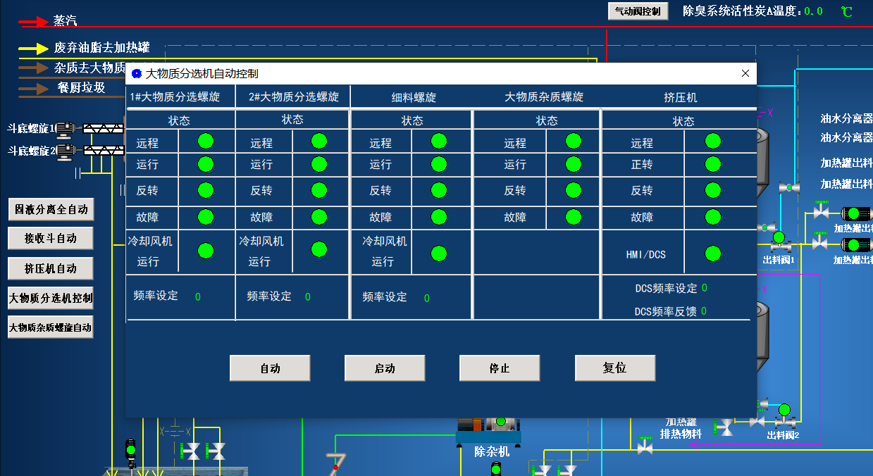 實(shí)時動態(tài)地顯示全廠工藝流程圖,實(shí)時動態(tài)畫面采用縱斷流程和平面流程相結(jié)合的流程圖顯示方式;流程圖中所有設(shè)備的運(yùn)行狀態(tài)采用不同顏色明確顯示其運(yùn)行狀態(tài)。