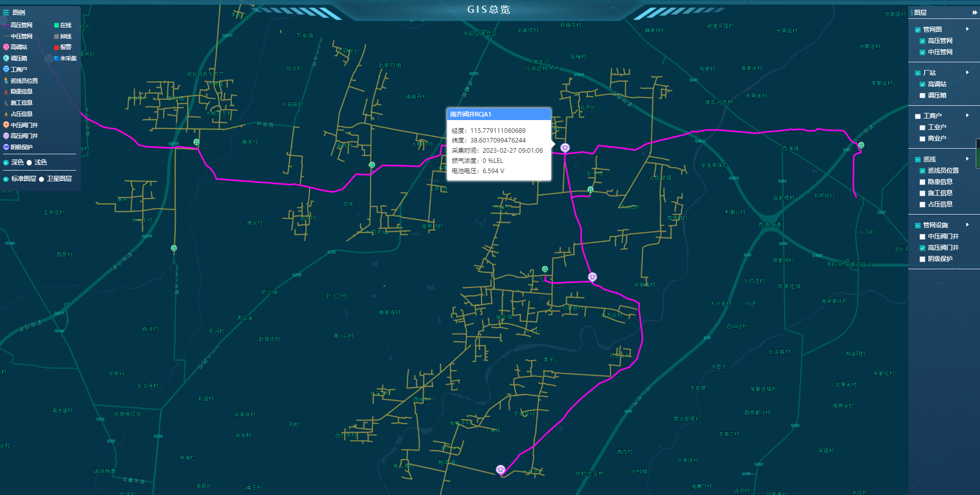 生產(chǎn)運(yùn)行監(jiān)控主要借助SCADA系統(tǒng)將分布在管轄區(qū)域內(nèi)場(chǎng)站、閥室、調(diào)壓站、用戶、加氣站所采集的管網(wǎng)設(shè)備的運(yùn)行參數(shù)匯集上來(lái),從而掌握整個(gè)管網(wǎng)的運(yùn)行情況,并對(duì)運(yùn)行設(shè)備進(jìn)行實(shí)時(shí)監(jiān)控。系統(tǒng)出入口采用GIS地圖和場(chǎng)站檢索組合方式,可通過(guò)地圖查看也可通過(guò)搜索進(jìn)入該場(chǎng)站。