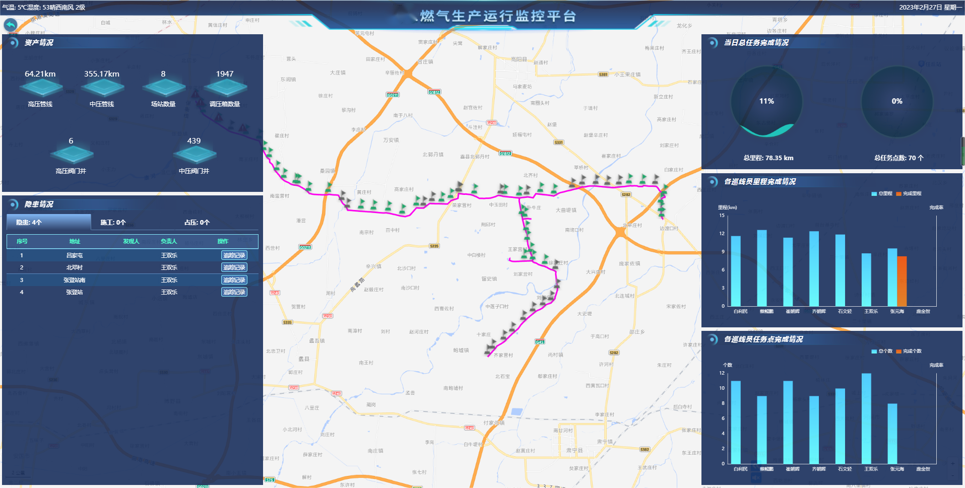 管線巡檢主要實(shí)現(xiàn)場(chǎng)站巡檢管理、長(zhǎng)輸管線、城市管網(wǎng)巡線管理以及遠(yuǎn)程交接班管理。該功能模塊主要包括路線繪制、計(jì)劃制定、計(jì)劃分配、巡線監(jiān)控、軌跡回放、隱患上報(bào)、任務(wù)統(tǒng)計(jì)分析等。