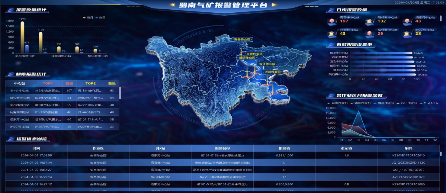 報(bào)警平臺(tái)實(shí)現(xiàn)各類報(bào)警數(shù)據(jù)統(tǒng)一接入平臺(tái),實(shí)現(xiàn)集中查看、集中管理,針對(duì)中心站、作業(yè)區(qū)、氣礦等各個(gè)層級(jí)的報(bào)警分析,根據(jù)業(yè)務(wù)需要可自由查看每一級(jí)組織機(jī)構(gòu)的報(bào)警數(shù)據(jù)。同時(shí),基于報(bào)警合理化分析,可有效減少一線人員的報(bào)警量,提高調(diào)度人員的工作效率,為下一步“少人值守”奠定的信息基礎(chǔ)。