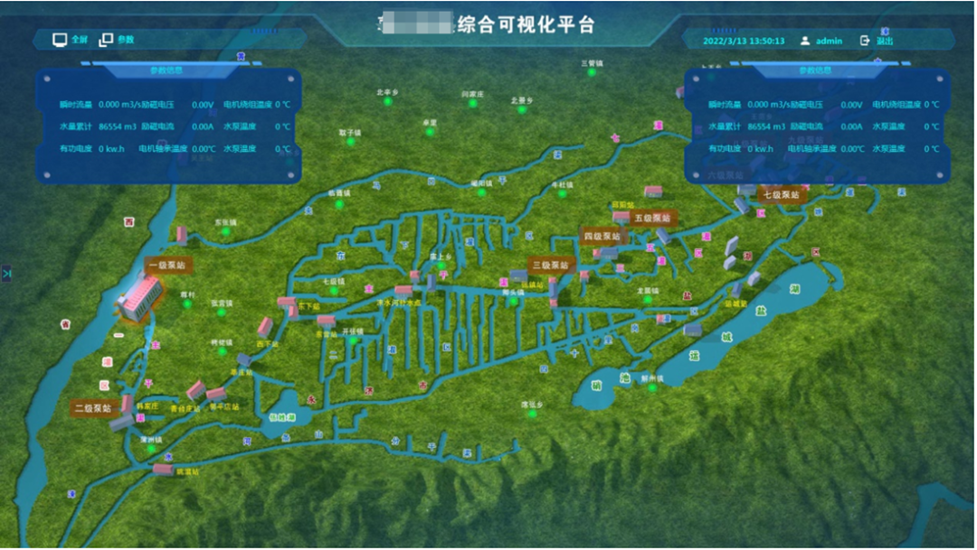 通過對泵站供水的地理位置信息進行3D繪制,精準展現(xiàn)地理布局,標注河道位置、走向及泵站位置。該系統(tǒng)實時接入泵站的電壓、電流、流量等運行數(shù)據(jù),通過圖表直觀展示泵站狀態(tài)。
